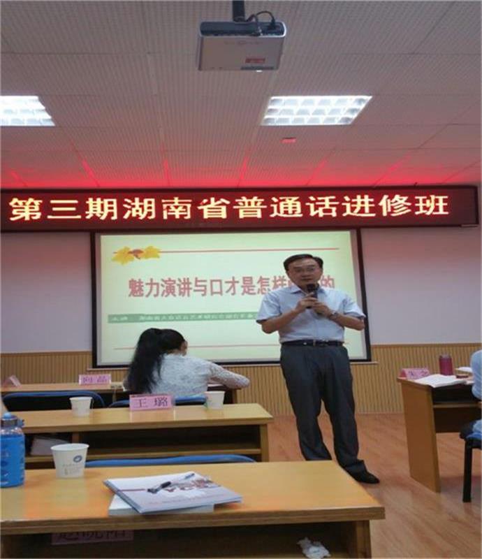 本期进修班的学员来自全省14个市州的70多所农村中小学校。培训班以普通话理论和口语水平提高为主要目的和主要内容,在普通话基础知识的教学和普通话语音辅导中,穿插了语言文字艺术和语言文字规范专题讲座。湖南大众语言艺术研究会作为语言文字工作社团,聚集了众多语言文字工作和艺术方面的专家。为办好这期普通话进修班,省语委与我研究会联系,聘请副会长高广安、谢伦浩、蒋维、周萍萍,以及研究会朗诵专业委员会主任吕铭、播音主持专业委员会主任白莹为培训班专题主讲教师,分别担任了《新时期语言文字工作方针政策》《语言文字规范标准》《普通话概说》《说话及普通话水平测试中词汇语法问题》《声调和语调》《朗读》《朗诵》《青少年播音与主持》《演讲》《辩论》等专题讲座。他们的讲座内容丰富,语言生动,受到语委领导和学员的充分肯定和一致好评,为我会与省语委的工作合作建立了良好开端和基础。
