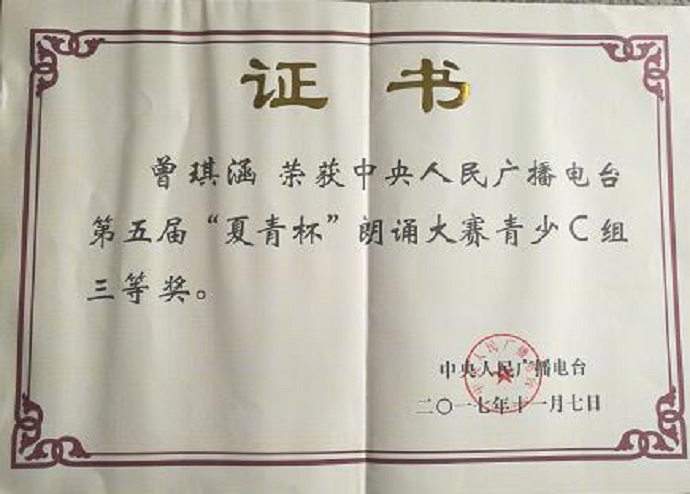 11月7日,中央人民广播电台第五届夏青杯朗诵大赛总决赛暨颁奖盛典绚烂落幕,大赛自今年初正式启动以来,全国77个赛区95万余名选手积极报名参与。比赛分青少年ABC组、成人组以及影视配音组,共颁发一等奖7名、二等奖18名、三等奖32名、最高人气奖1名、最佳舞台表现奖1名、最具潜力新人奖1名、伯乐奖7名,特别贡献奖5个、优秀组织奖15个等87个奖杯(牌)。出任评审的名家大咖有铁城、赵忠祥、傅成励、瞿弦和、于芳、丁建华、敬一丹、骆英、李修平、林达信、长啸、任志宏、李立宏、李晓冰、魏漫伦、苏扬、郑晶。中央电台台长阎晓明、夏青的夫人葛兰及评委、嘉宾等为获奖选手及优秀赛区颁奖。大赛组委会秘书长王静表示,刚刚落幕的“夏青杯”赛事,不能简单的用圆满表达,而是绚烂!