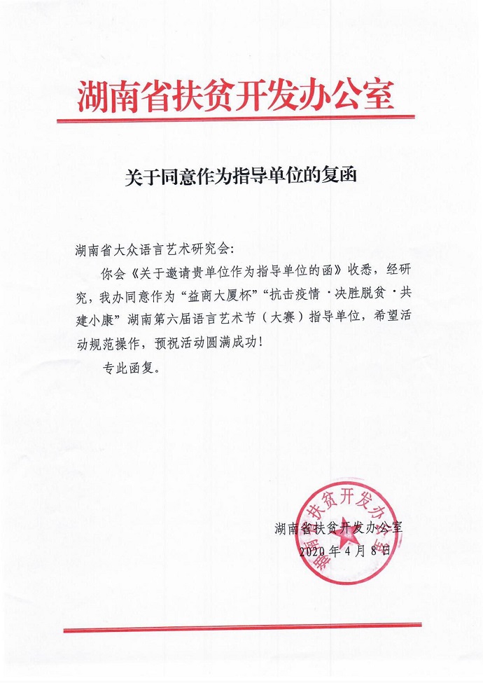 为响应习总书记关于扶贫、抗疫情、奔小康的决胜号令,宣传中央关于抗击疫情、脱贫攻坚、全面建成小康社会的决策部署,宣传湖南扶贫、抗疫情、新农村建设的工作历程、伟大成就和典型人物事迹,进一步推进文化自信、文化强省,发掘、打造语言艺术人才,更好地服务乡村、服务基层、服务大众。决定继续举办一年一度的语言艺术节,即:“益商大厦杯”“抗击疫情·决胜脱贫·共建小康”湖南第六届语言艺术节(大赛)。