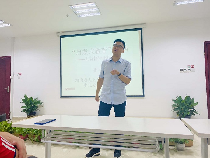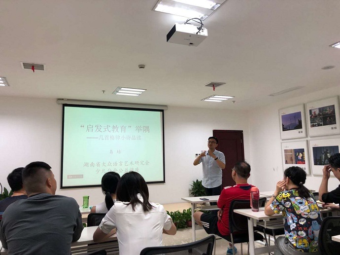 这次的主讲人是湖南大众传媒学院的易培老师,他不仅是长沙市金话筒演诵艺术团理事长,还是去年湖南省大众语言艺术研究会少儿分会的“优秀会员”。他主要通过四五首格律小诗的鉴赏品读,与在座的幼教工作者进行了有关“启发式教育”的交流。