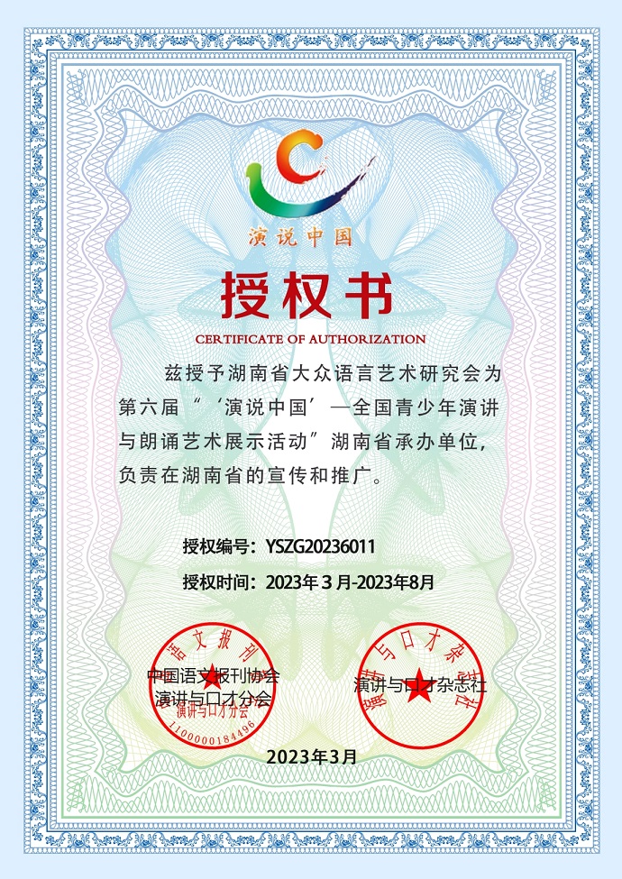 为贯彻落实党的二十大报告“要坚守中华文化立场,提炼展示中华文明的精神标识和文化精髓,加快构建中国话语和中国叙事体系”精神,更好地讲好中国故事,传播好中国声音,充分发挥语言艺术作用,引导青少年通过自己的声音展现可信、可爱、可敬的中国形象,中国语文报刊协会演讲与口才分会、演讲与口才杂志社和北京演讲与口才学会联合举办第六届“‘演说中国’——全国青少年演讲与朗诵艺术展示活动”。本会负责湖南展区工作。